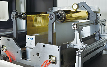 烫印处的收放卷装置有回拉功能,能够充分利用并节省电化铝,降低生产成本。